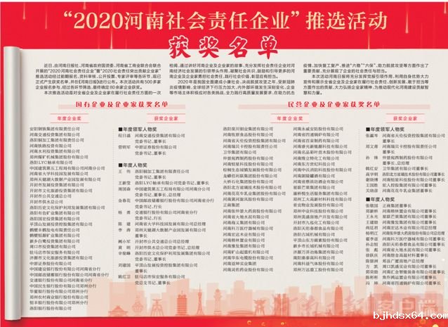 近日,由河南日报社、河南省政府国资委、河南省工商业联合会联合开展的“2020河南社会责任企业”暨“2020社会责任突出贡献企业家”推选活动经过前期报名、资料审核、公开投票、专家评审等各环节,现已正式产生获奖名单,并在《河南日报》进行公布。本次活动共有500多家企业报名参与,经过各环节筛选,最终确定80余家企业获奖。