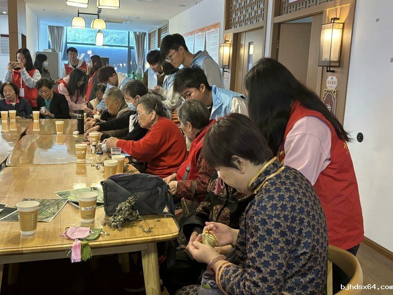 本草有折衷,儒医用功深。随后志愿者组织开展中医药辨认小游戏,将带来的金银花等样本现场分发供老人辨认,并带领老人们一同编制艾草香囊,老人们按照志愿者的指导小心翼翼地将艾草包进空囊中,喜笑颜开,他们握着手里的香囊,与志愿者交流心得体会并进行合影留念。艾草香囊不仅是安养之道,也承载着礼与情,代表招百福,志愿者通过这样的方式希望老人们能把平安健康的美好祝愿收入囊中。