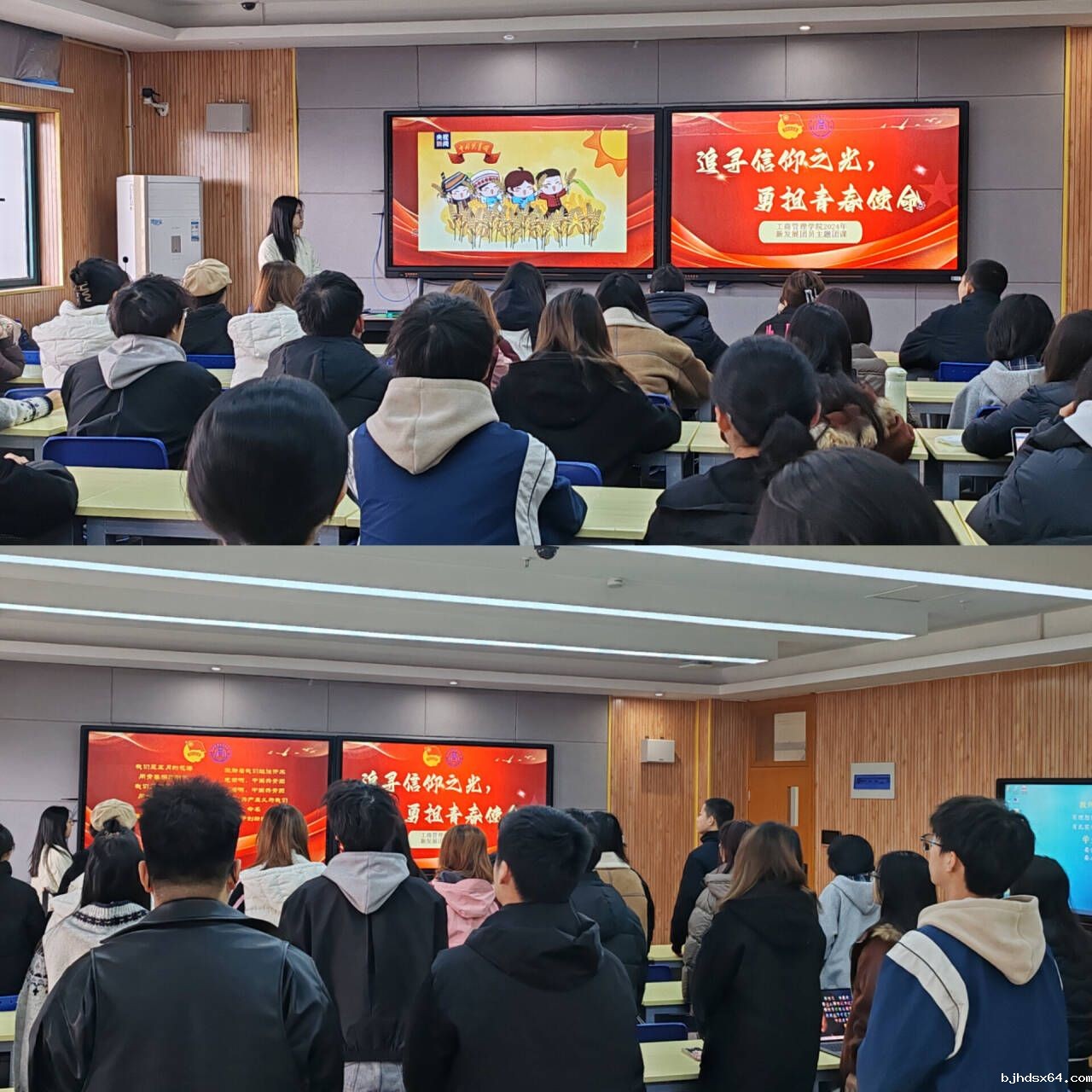 “追寻信仰之光,勇担青春使命”主题团课 ——本次团课生动地讲述了共青团自成立以来,在各个历史时期紧密围绕党的中心任务,团结带领广大青年冲锋在前、担当作为的壮丽历程。集中展现了百年来中国青年爱党、爱国、爱人民的赤诚追求。新发展团员们深入学习了中国共青团的百年奋斗征程和历史启示,相信在以后的学习和生活中,他们能够弘扬五四精神,践行青春誓言,奋力书写为中国式现代化挺膺担当的青春篇章。