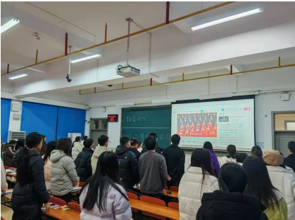 活动伊始,团支书李欣点明主旨,强调“一带一路”倡议对国家发展及国际合作的深远意义,以及铭记南京大屠杀等历史国耻对当代青年砥砺前行的重要性。随后,全体同学起立,在团支书的带领下,齐声高唱团歌。激昂的旋律回荡在活动现场,进一步激发了同学们的青春活力与爱国热情。