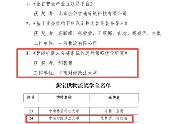 (通讯员刘筱佳、南天亮、朱梦丽、杨妍洁)近日,2024年宝供物流奖评审结束,经教师与学生申请、班级及学院评审,中国光华科技基金会终审,我院物流管理系邹碧攀教授的论文《智能机器人分拣系统的运行策略优化研究》荣获宝供物流奖三等奖,物流管理2101班本科生朱梦丽、杨妍洁荣获2024年度宝供物流奖学金。