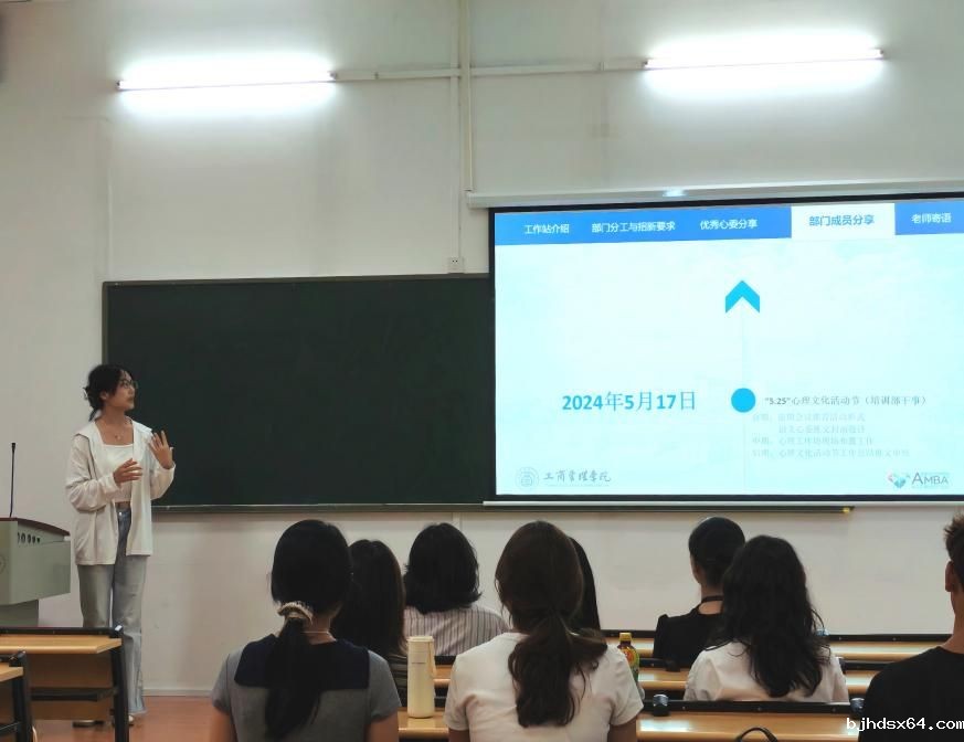 随后,工作站成员李晴萱同学上台,围绕学院心理健康教育体系展开详细介绍,提及工作站过往积累的荣誉基础,让新心委全面了解工作站的职能定位、运行模式与发展底蕴,快速建立对组织的认知与认同。王星蕴同学则清晰地梳理了工作站的组成框架——由宣传部、项目部、培训部三大部门协同运作,并简要说明各部门核心职能,让新心委对学院心理工作的整体布局有了全面且深入的认识。